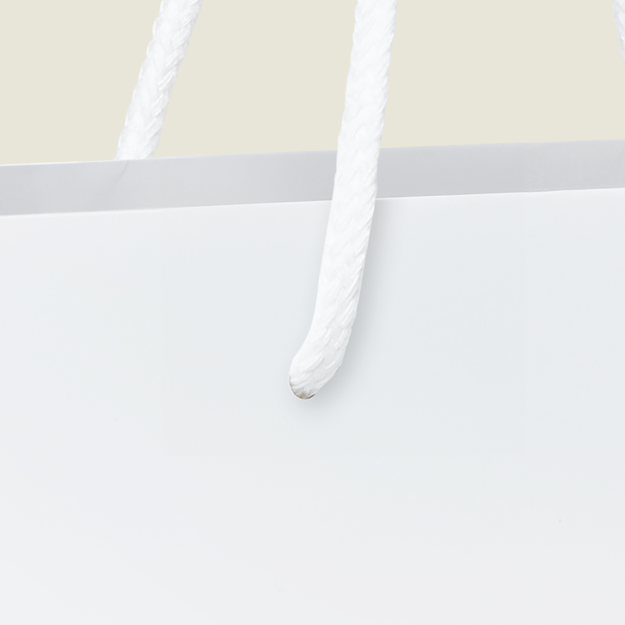 Glued handles are permanently affixed to the bag's body, offering a sleek and seamless appearance. The rope ends are securely glued beneath the reinforced turnover top (TOT), emerging through precisely cut slots. This method ensures a clean exterior finish, ideal for high-end retail packaging where aesthetics are paramount.